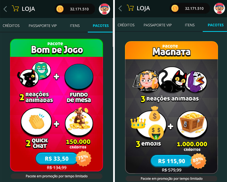 Esses pacotes chegam como mais uma opção para quem quer aproveitar vantagens dentro do app, com itens e benefícios que ajudam a turbinar sua experiência nas partidas.