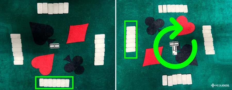 Começa o jogador que possui a peça mais alta, normalmente o “duplo-seis” (6-6). Caso ninguém tenha, segue-se a ordem decrescente (5-5, 4-4, etc.). Então, a partir desse jogador, o jogo segue no sentido anti-horário.