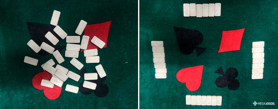 - As peças são colocadas com os números para baixo sobre a mesa e embaralhadas.