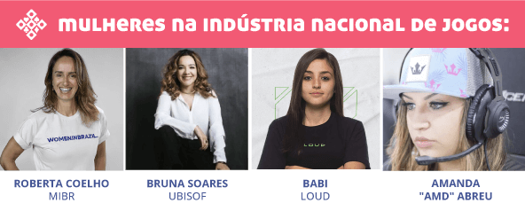 No Brasil, também temos nomes de destaque no setor, como líderes (Roberta Coelho, MIBR), executivas (Bruna Soares, Ubisoft), influenciadoras (Babi, LOUD) e pro players (Amanda “Amd” Abreu).