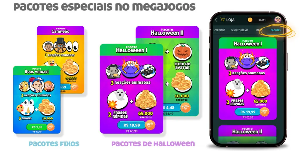 Além dos torneios, o Halloween MegaJogos também chega com promoções temáticas exclusivas por tempo limitado. São aquelas ofertas que aparecem só em outubro e depois desaparecem como um fantasma na noite.