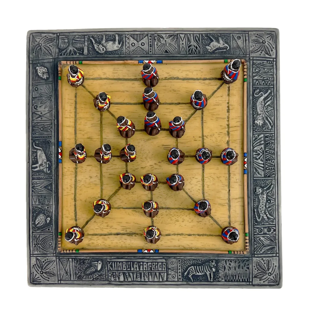 - Morabaraba (África do Sul, Lesoto e Botswana): Jogo tradicional dos povos Sotho e Zulu, semelhante ao “Nine Men’s Morris”. O objetivo é formar “moinhos”, alinhando três peças. É tão importante culturalmente que existem até campeonatos internacionais.
